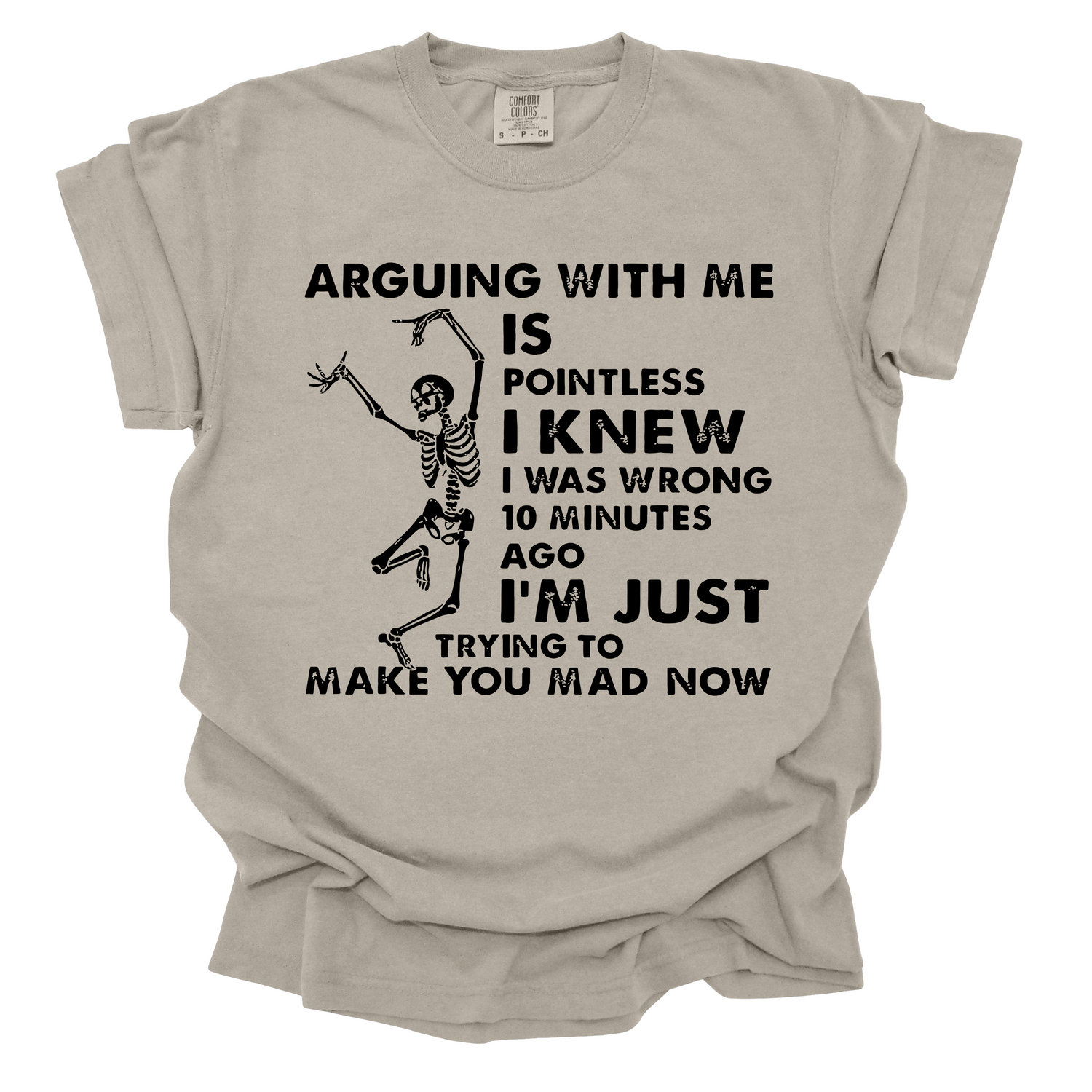 Unleash your inner chaos coordinator with this soft, classic-fit t-shirt. With the phrase "ARGUING WITH ME IS POINTLESS I KNEW I WAS WRONG 10 MINUTES AGO I'M JUST TRYING TO MAKE YOU MAD NOW" printed on the front, you'll bring a laugh to any room.