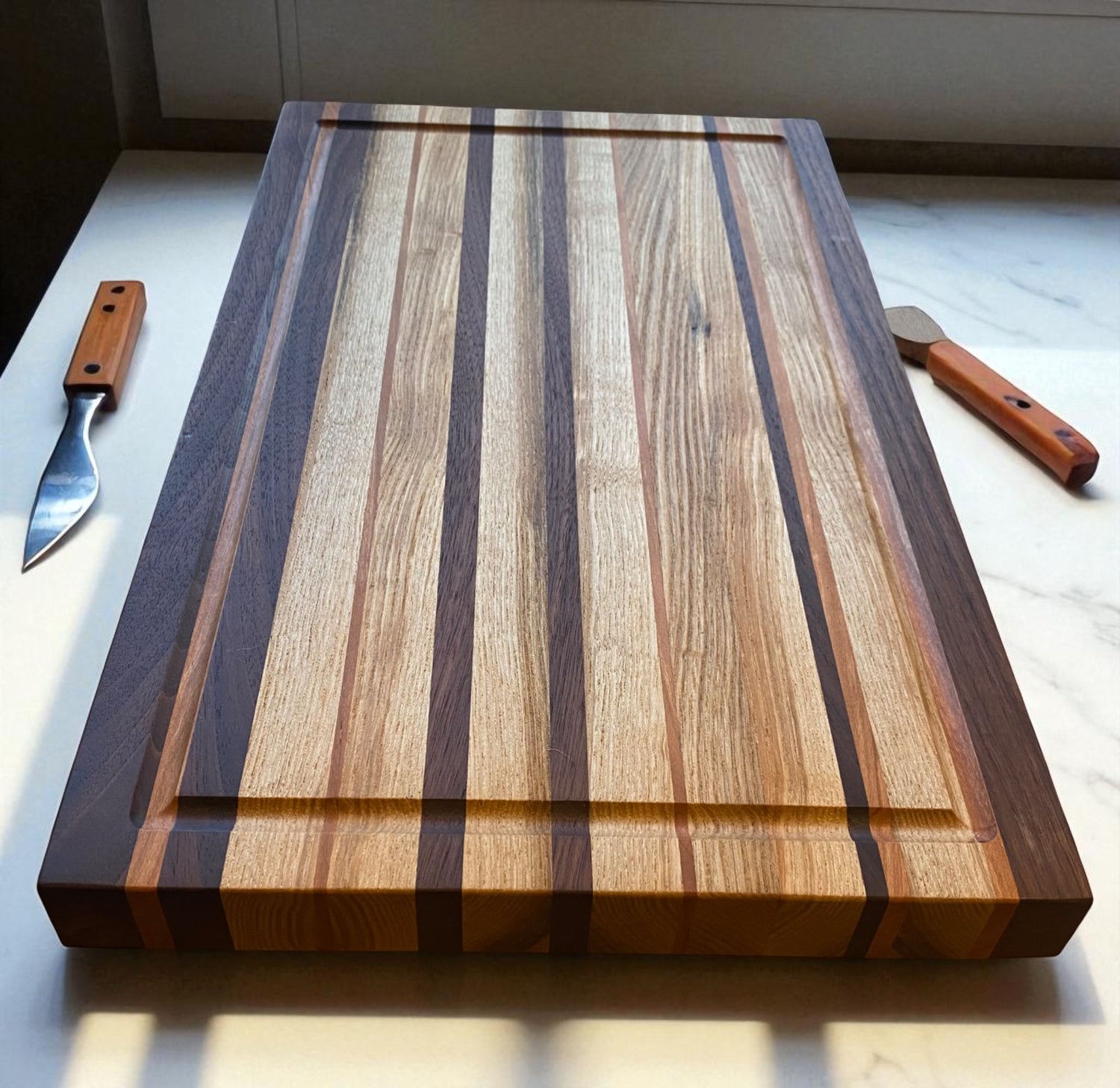 The heart of a kitchen is where food and family meet, and this handmade butcher block is crafted to be right at the center of it all. Each board is a unique work of art, with a rich, multi-wood design that tells its own story through its natural patterns. The functional juice groove makes for easy cleanup after carving juicy roasts, and the robust construction is built to last a lifetime. Paired with sturdy rubber feet, this board stays perfectly in place, giving you the confidence to chop, slice, and serve with love and precision.